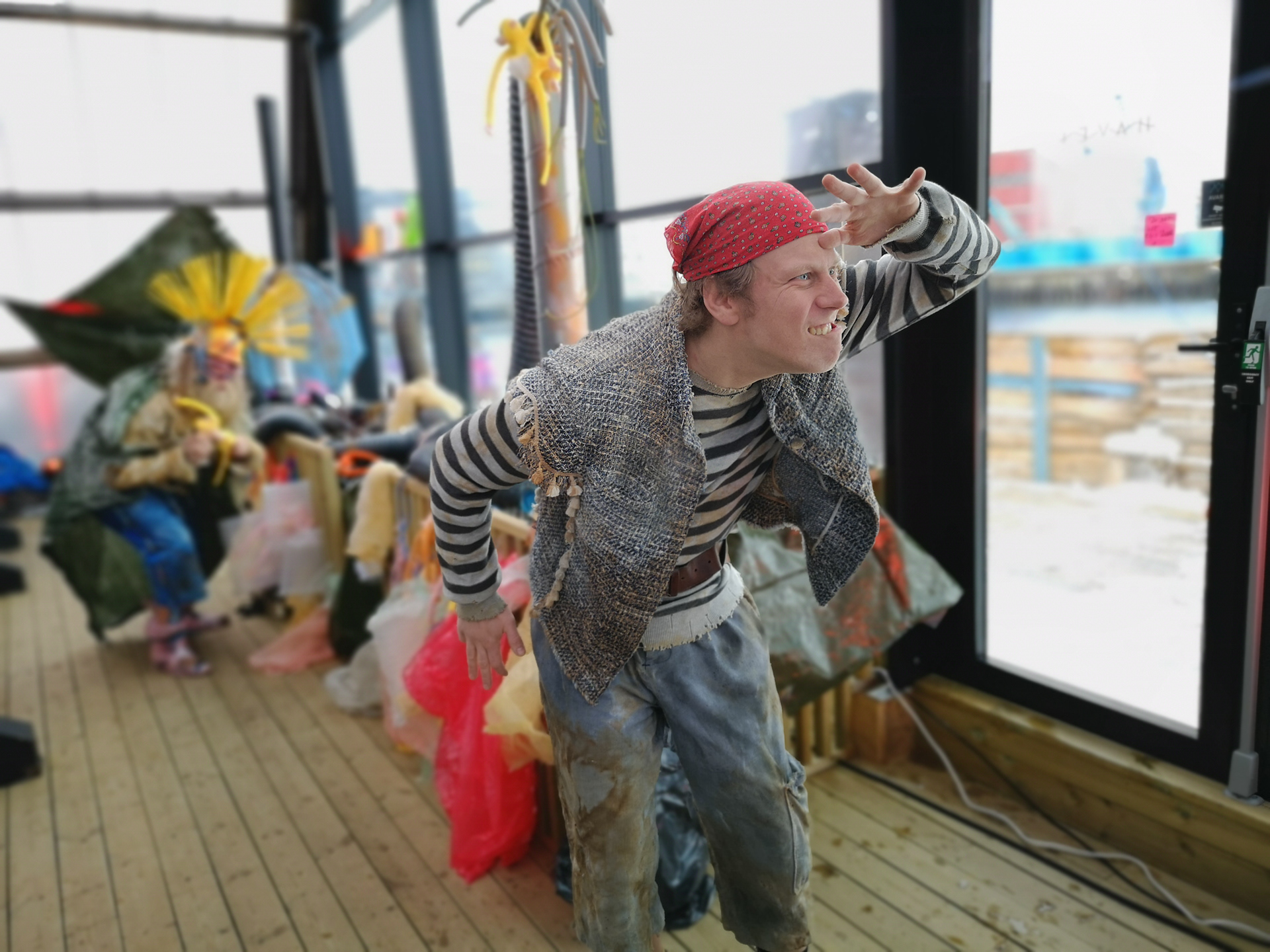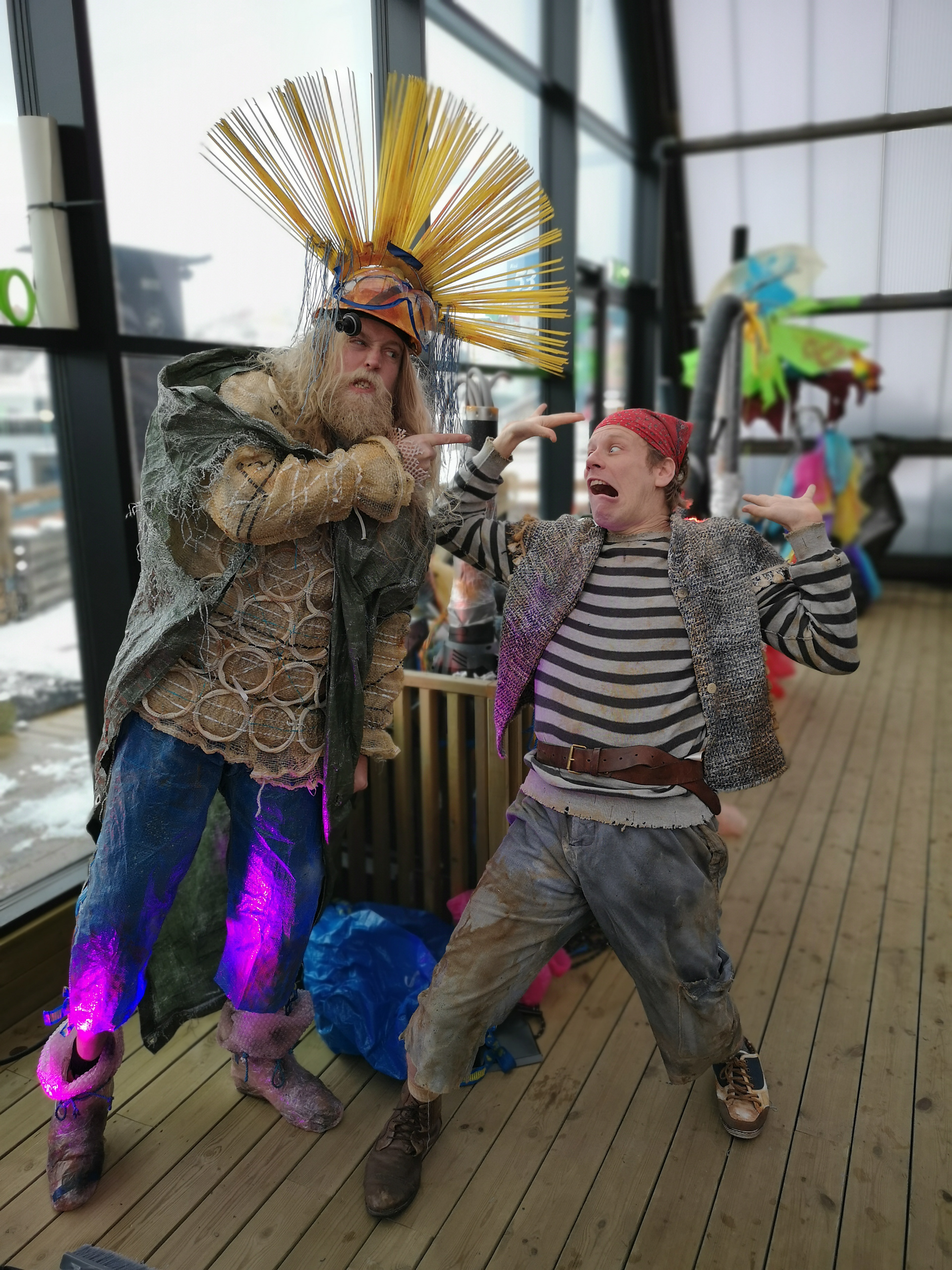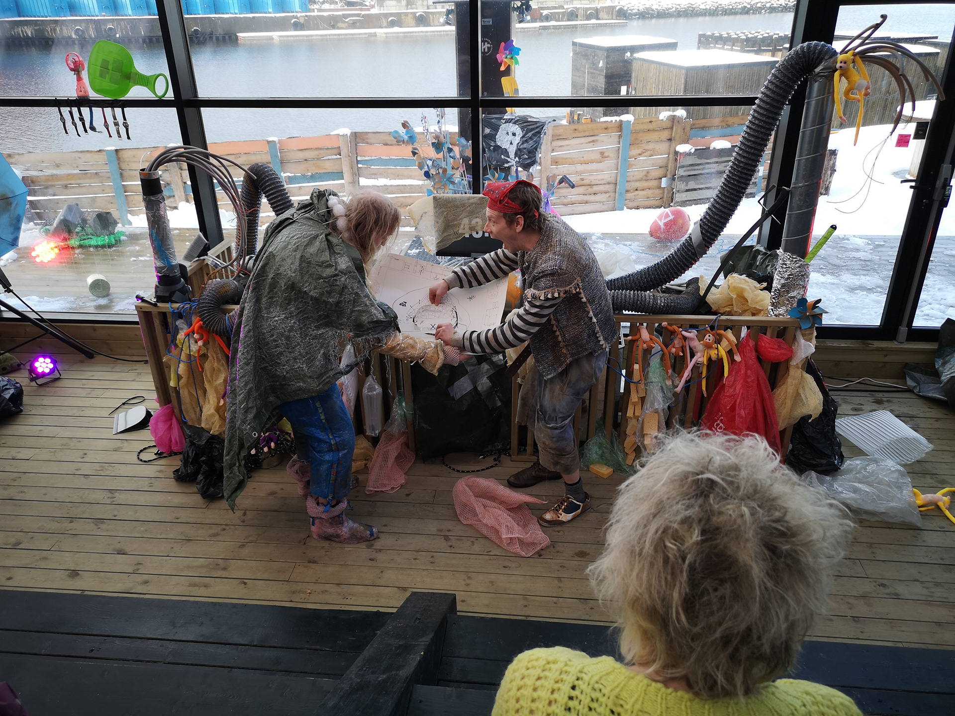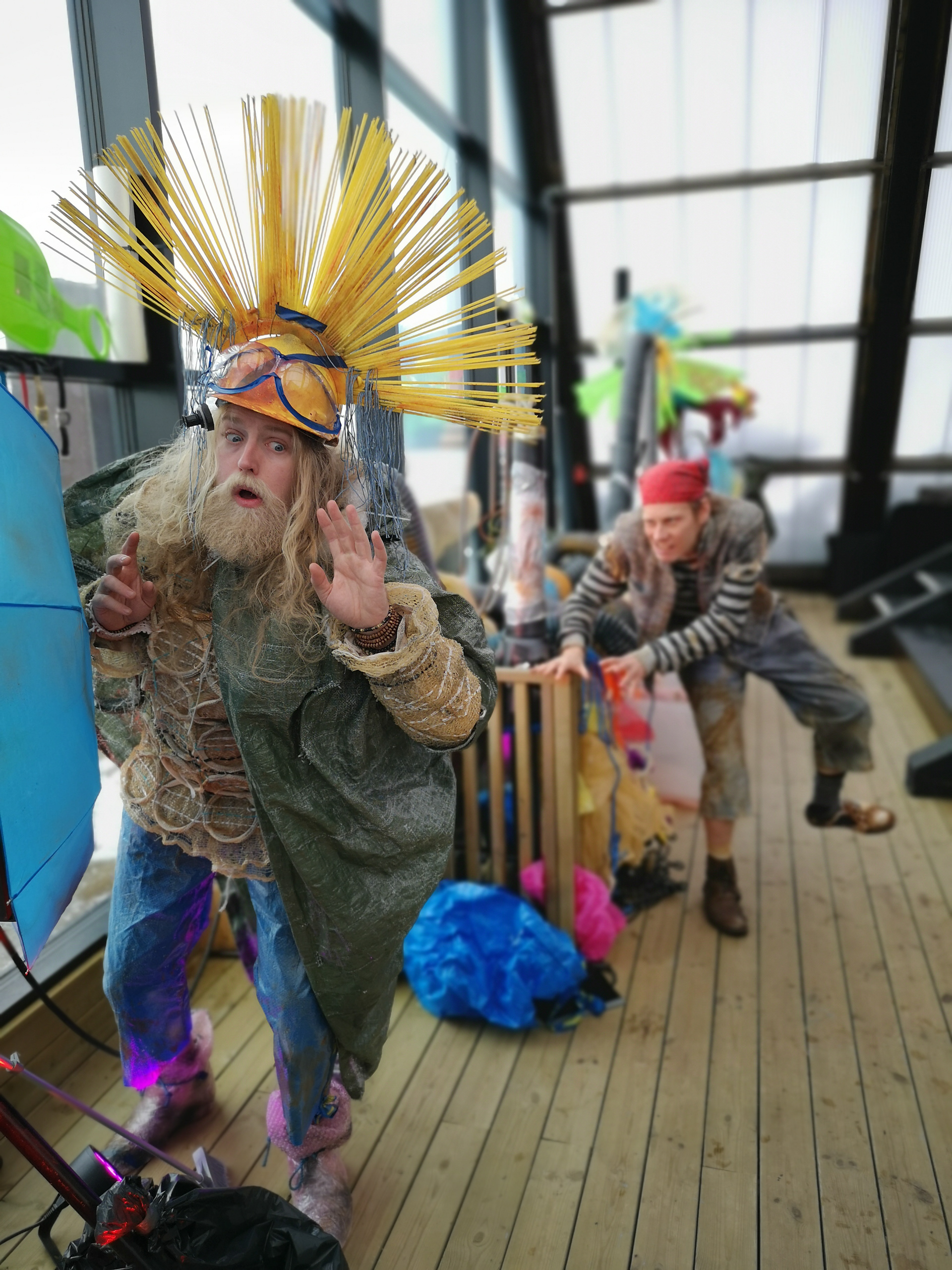 Skatten på Søppeløya(2023) Teater Basun Regi: Christine Therese Aspenberg Scenografi: Teater Basun Kostymedesign: Berit Haltvik With Foto: Berit Haltvik With Alle kostymene er laget av søppel og gjenbruksmaterial.