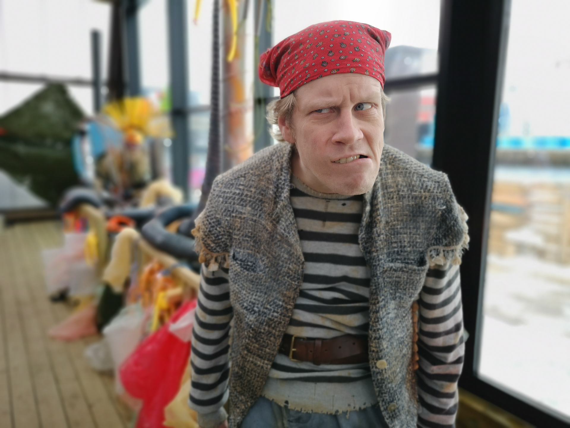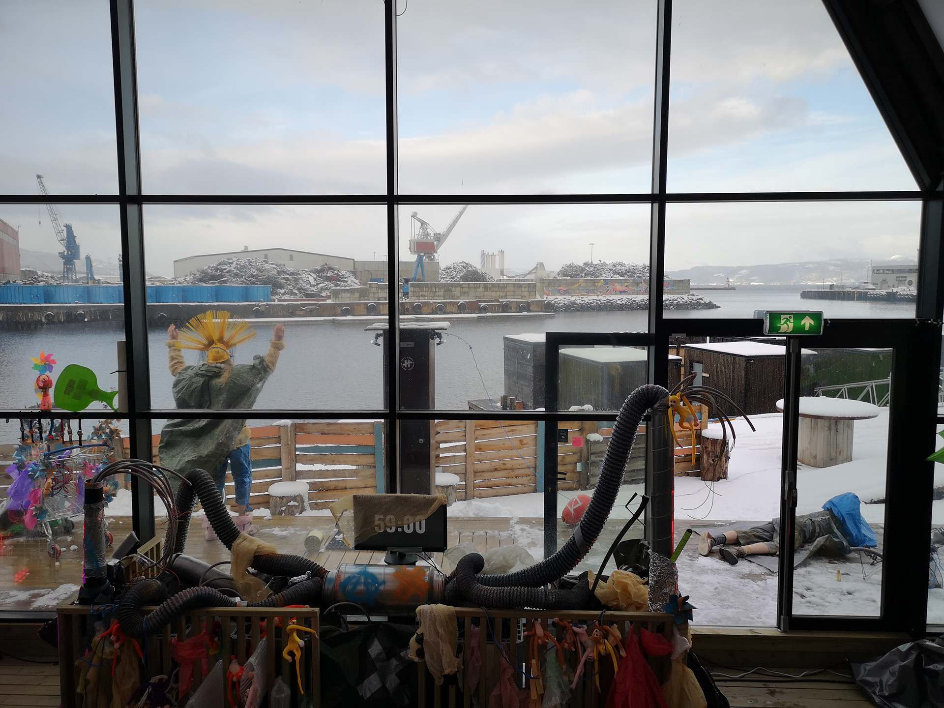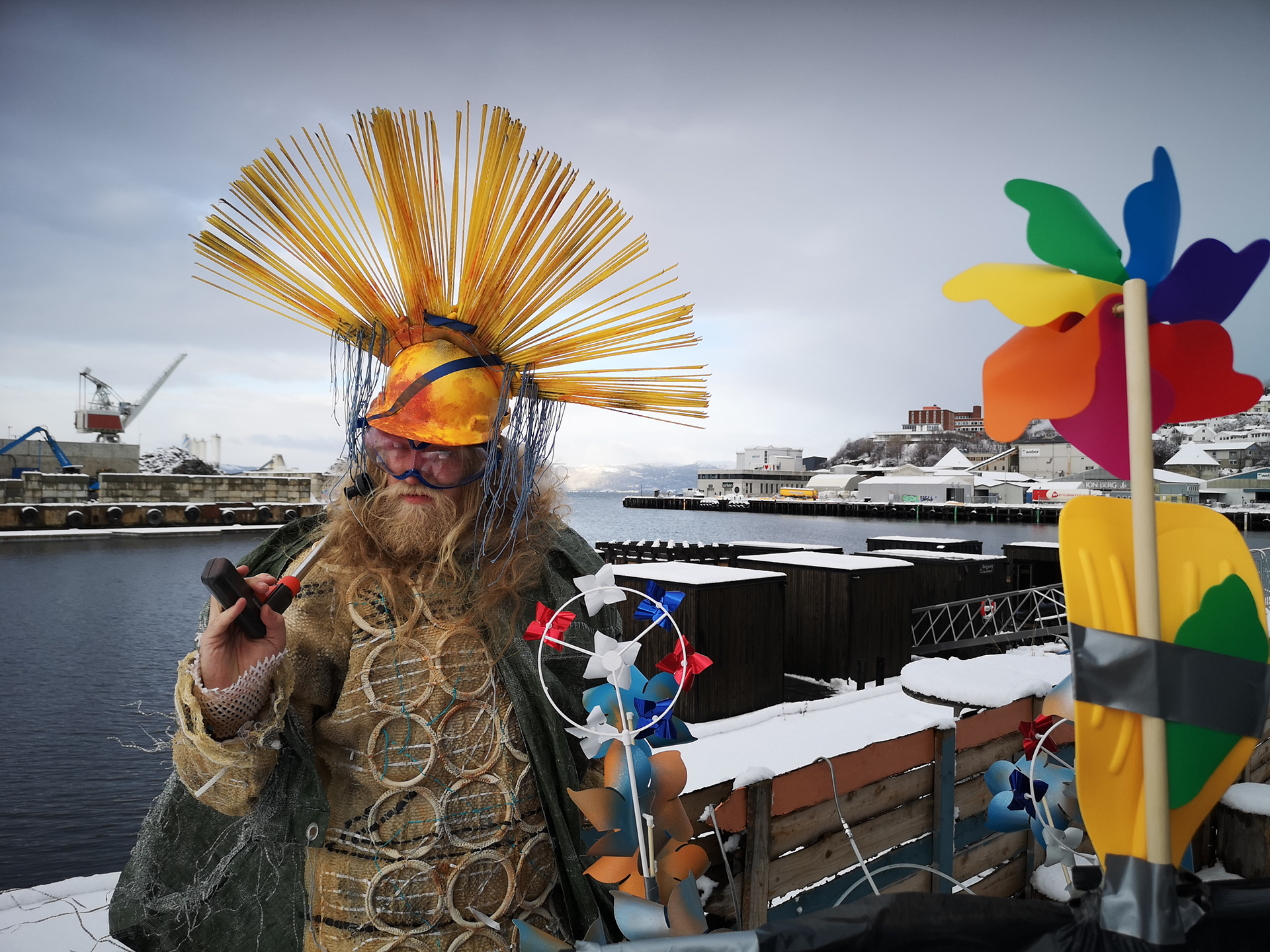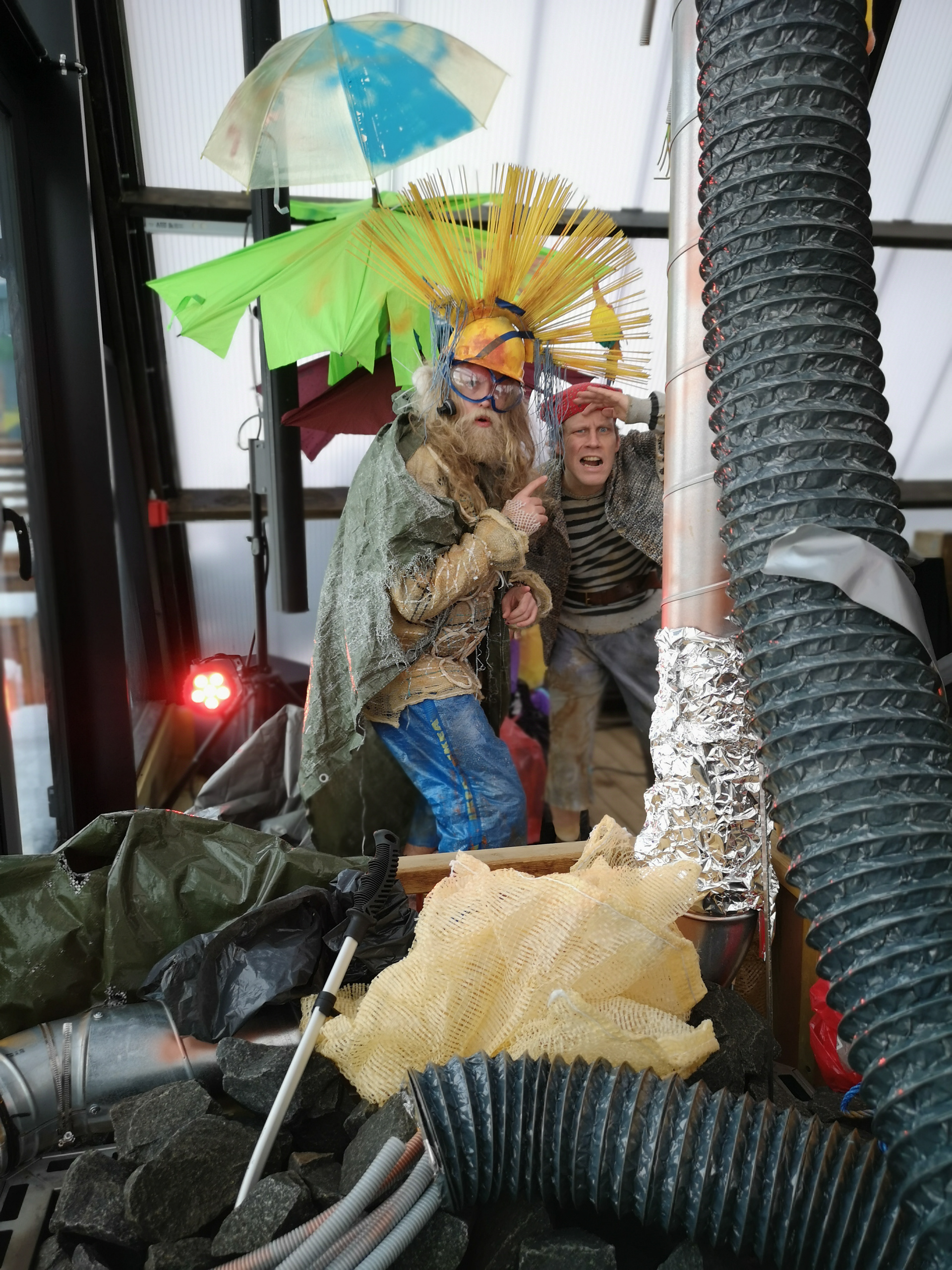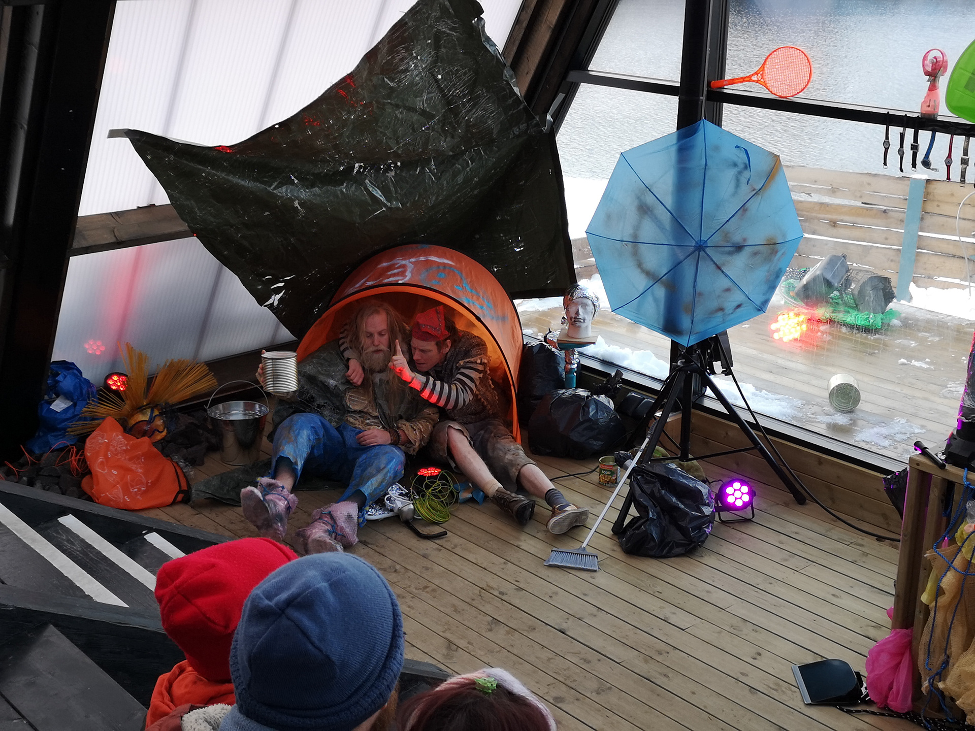 Skatten på Søppeløya(2023) Teater Basun Regi: Christine Therese Aspenberg Scenografi: Teater Basun Kostymedesign: Berit Haltvik With Foto: Berit Haltvik With Alle kostymene er laget av søppel og gjenbruksmaterial.